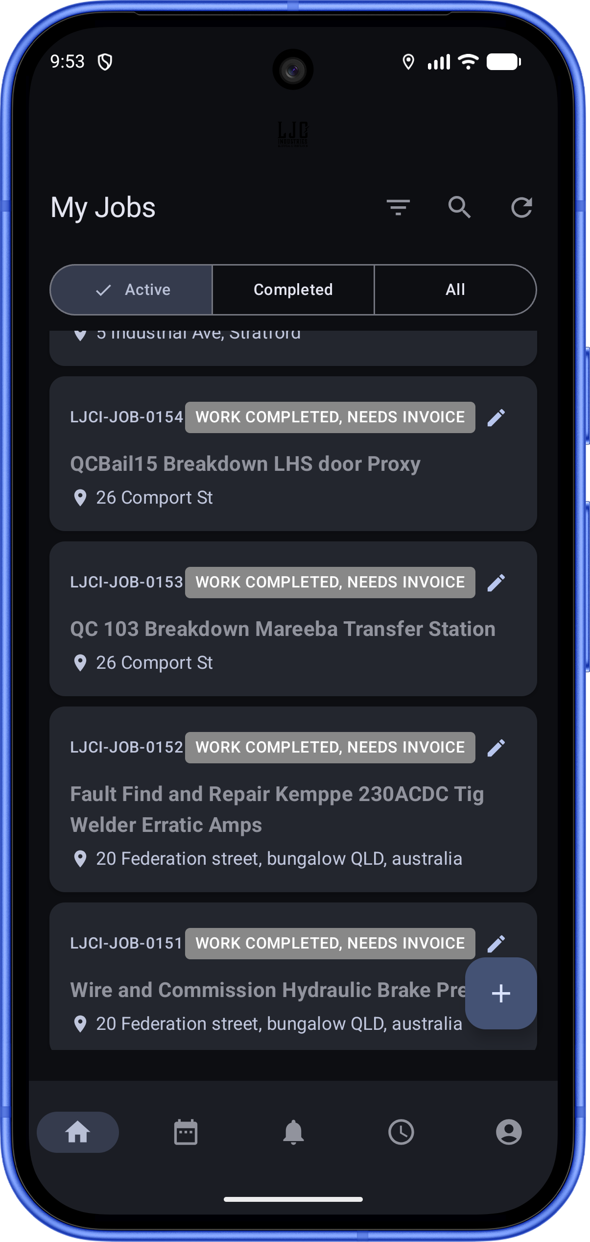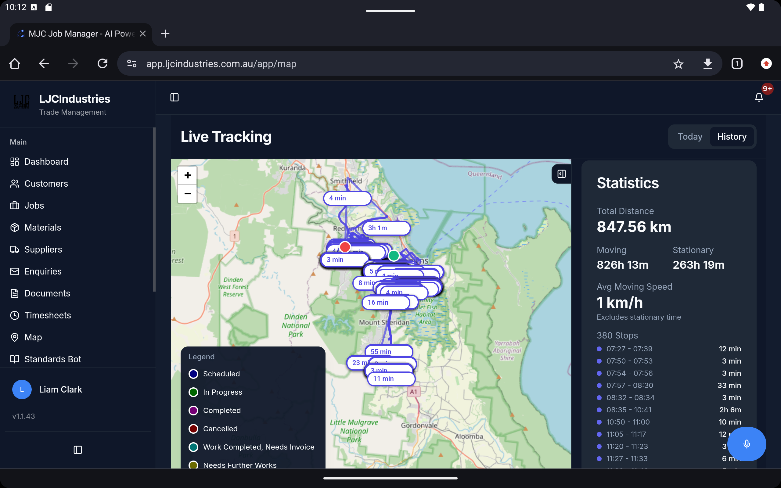 The complete job, quote, invoice and field-tracking platform for trades. Web dashboard, Android companion, live GPS tracking and document workflow — all under one roof, on your server or ours.